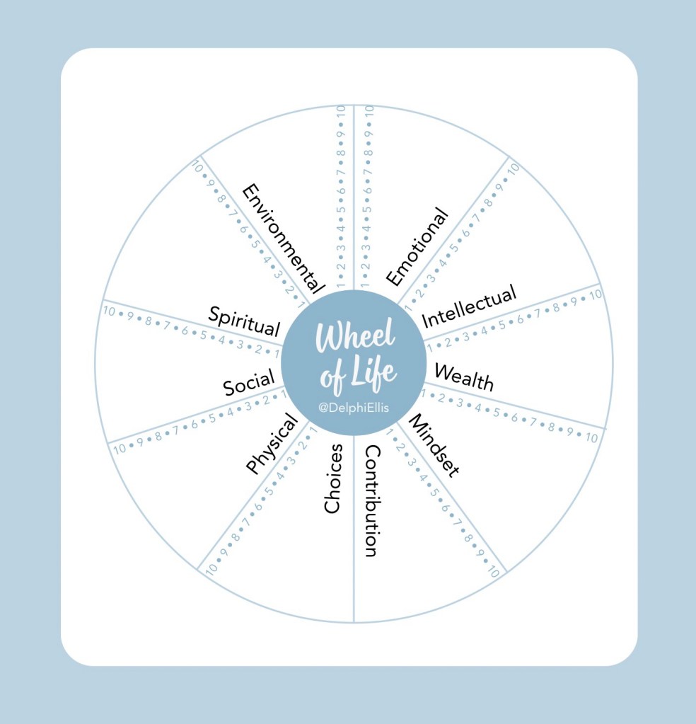 Using the diagram below as a template, if it’s helpful, score on a scale of 1-10 where you feel you are in each of the dimensions and think about what score you’d like to achieve realistically in the next month/year or whatever achievable time frame you have in mind. Then, looking at your completed wheel; you could use this information to decide which areas will be a priority.