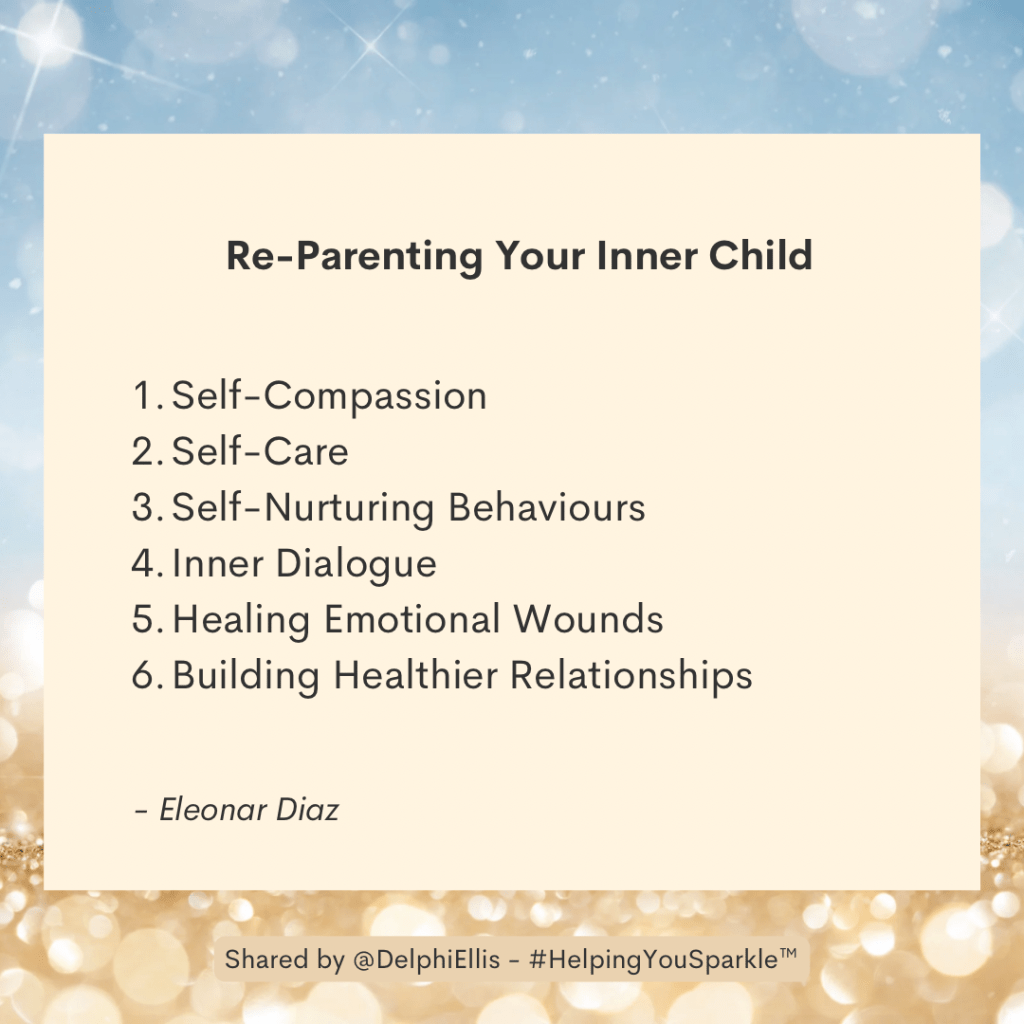 In her book, The Shadow Work Experience for Beginners, Eleonar Diaz explains the therapeutic process of healing the experiences of needs not being met during childhood. She offers a six-step process, listed in the image here and expanded upon below, which can help us to begin “re-parenting” the inner child.