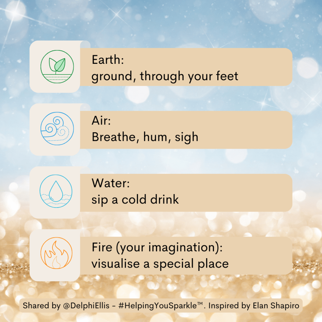 🌬️ Air: We know that breath activities can help regulate our nervous system, and we instinctively sigh when we are stressed. Extending the exhale on a deep breath (if you can), may shift our mindset from “I can’t cope” to “I can cope”. Emerging science also now tells us that humming can help on the out breath; this can be any song (or just sound) – some people choose “Happy Birthday” but whatever works for you.