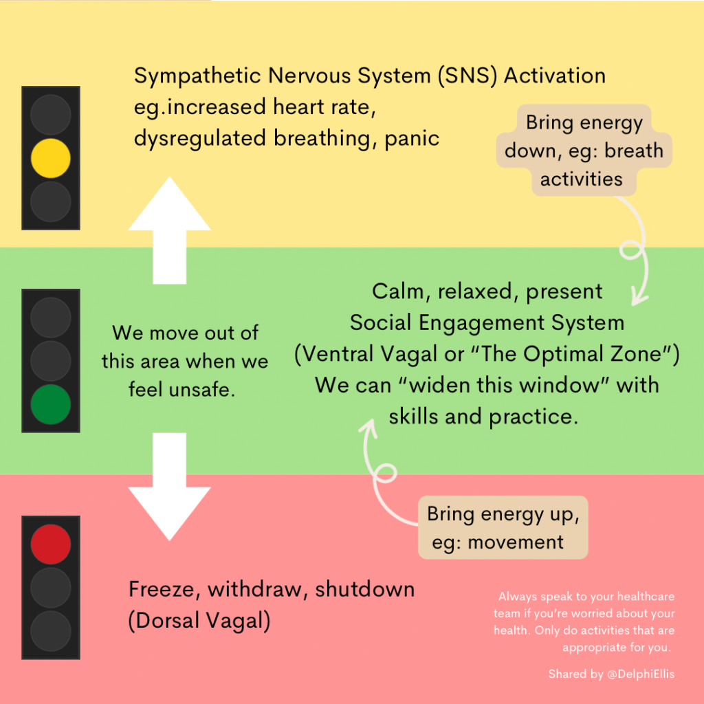 The good news is with emotion regulation skills, somatic (body) awareness and an understanding of how their nervous system is operating, someone may find that they can move back to the Optimal Zone or ventral vagal state with time and practice – and especially with help. This is why co-regulation – we now know that being around someone who is calm helps us feel calm – and good community can be important too.