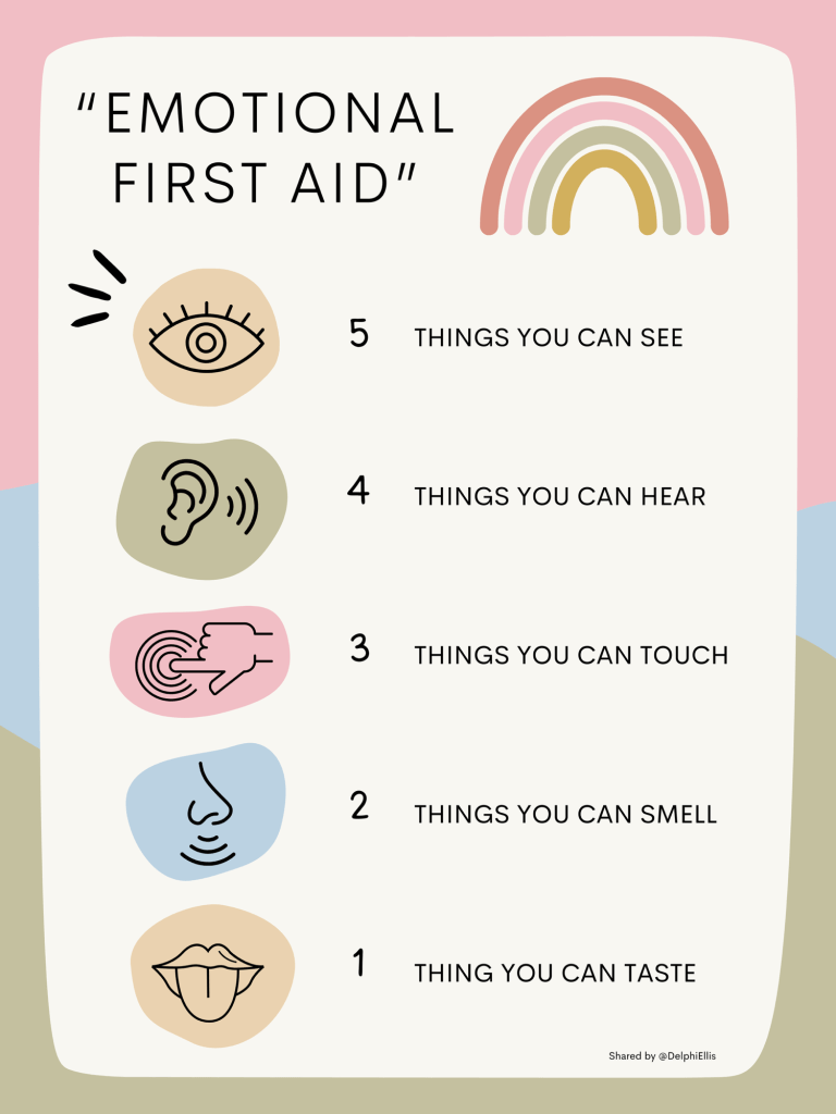 Being able to regulate our emotions in difficult moments can be key to managing overwhelm, and form part of an “Emotional First Aid Kit”. One way of doing this is with the 5-4-3-2-1 activity.